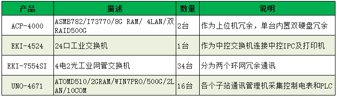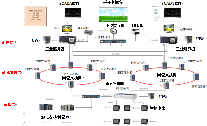 特点:通讯管理丰富的单台可处理现场100台电表与PLC的采集控制,并可达到整个系统1S内响应。2台ACP4000作为上位机冗余,单台内置双硬盘冗余;1台EKI-4524作为中控交换机连接中控IPC及打印机;34台EKI7554SI分为两个环网通讯;16台UNO4671做为各个子站通讯管理机采集控制电表和PLC 。