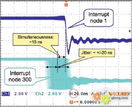 带有分布式时钟的EtherCAT系统的性能详见图2,详细记录了两个EtherCAT 同步的边缘变化。两个装置的分离通过300 个EtherCAT 节点和长度为120 m 的电缆实现。同步控制边缘变化的ADS 能够在几毫秒时间内传输所有的测量数据记录