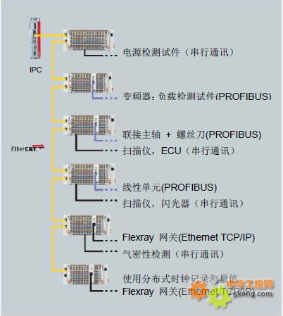 除了 EtherCAT具有高性能和过程值的精确分布式时基同步的特点之外,选择它作为基本总线系统的另外一个主要原因是前面所提到的接口可用作本地分布式EtherCAT 设备。此外,最终用户的一个重要要求是:在设备数量增加时能够通过扩展总线的方式添加新的模块。通过分布式配置上述接口(见图1),能够在仅增加少量布线和安装成本的前提下满足这一要求。过去所采用的多通道接口卡需要敷设数米长的串行电缆,而现在,所需的电缆长度被大大缩短,从而也极大限度地降低了干扰敏感度。