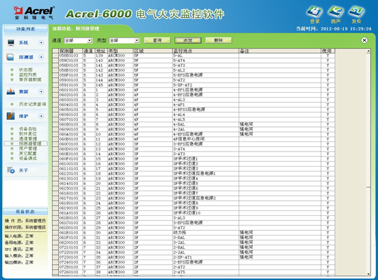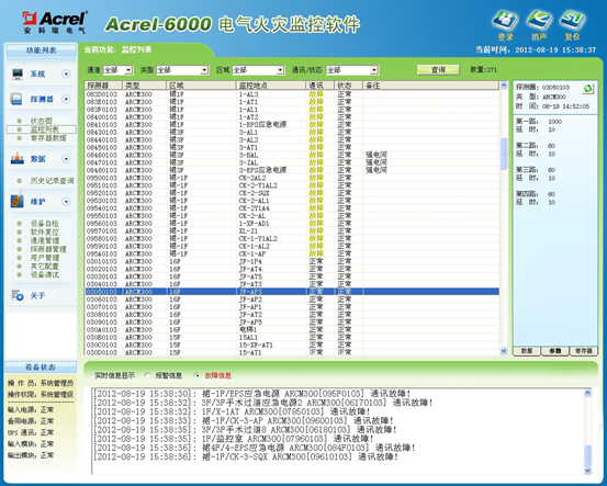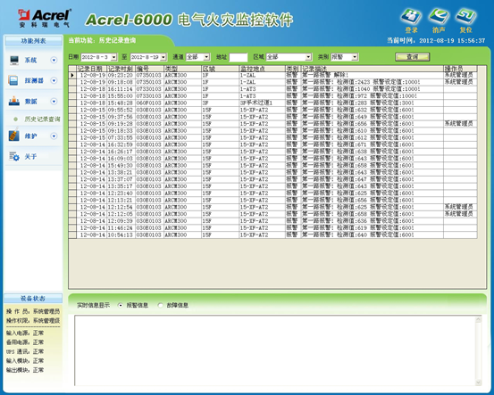 Acrel-6000电气火灾监控系统是本公司自主研发的用于接收剩余电流式电气火灾探测器等现场设备信号,以实现对被保护电气线路的报警、监视、控制、管理的运行于计算机的工业级硬件/软件系统。本系统应用于大型商场、生活小区、生产基础、办公大楼、商场酒店等区域的消防控制中心,对分散在建筑内的探测器进行遥测、遥调、遥控、遥信,方便实现监控与管理。本系统采用标准的Modbus现场总线将具有通信功能的探测器相互连接起来,当现场保护线路中的被探测参数超过报警设定值时,能发出报警信号、控制信号,能指示报警部位并保存报警信息。