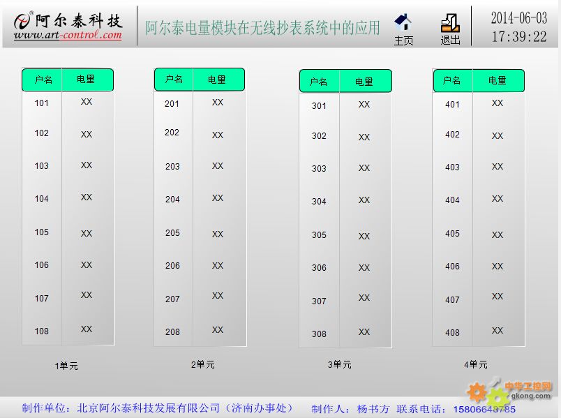 组态软件的设计主要是包块电量显示、报警功能、客户的用电记录以及用户查询等,下图是简单的演示界面,主要是显示每户的总的用电量的,这样就减少人力挨家挨户去抄表,同时客户在购买的电量快用完时,可以通过报警邮件发给户主,提醒户主预交电费的,